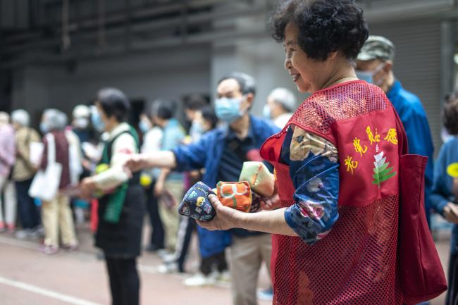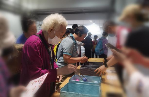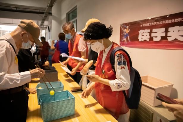 筷子夹球项目考验了老同志们的手指灵活和操作技巧,显示了他们的耐心和细致。