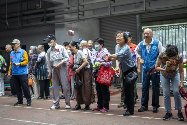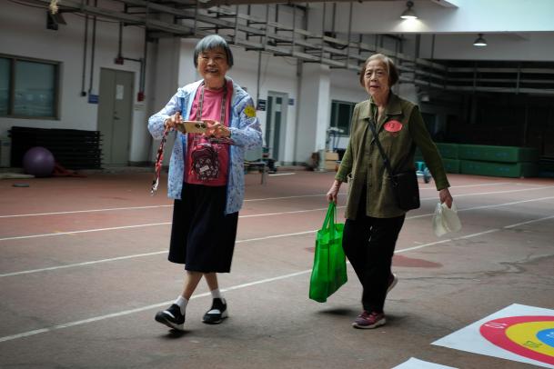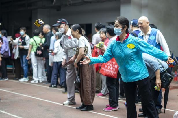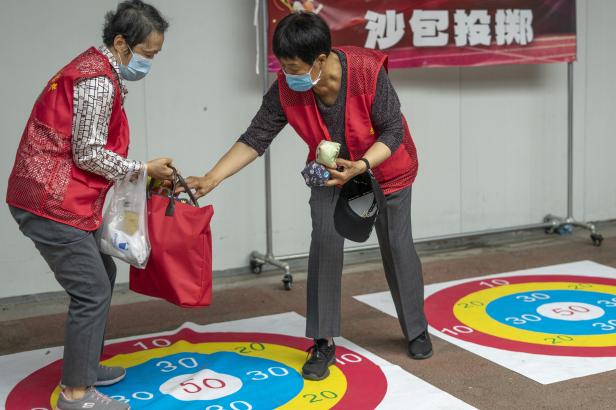 沙包投掷项目考验了老同志们的臂力和爆发力,他们在投掷沙包后欣赏自己的成绩、互相夸奖,展现了乐观开朗的心情。