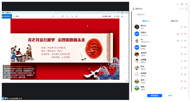 5月13日,学校关工委、离退休工作处/离退休教职工党委、材料学院、人文学院共同举办“中华优秀传统文化思政育人”系列活动之“青老共话红楼梦 启智润心向未来”云端讲座交流活动,“五老”代表、人文学院刘晓蕾老师、材料学院2021级硕士第三党支部党员和积极分子以及离退休工作处/离退休教职工党委的老师共50人参加。活动由离退休工作处/离退休教职工党委的辛丽春老师主持。