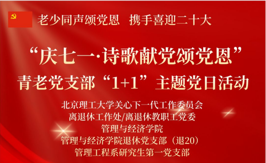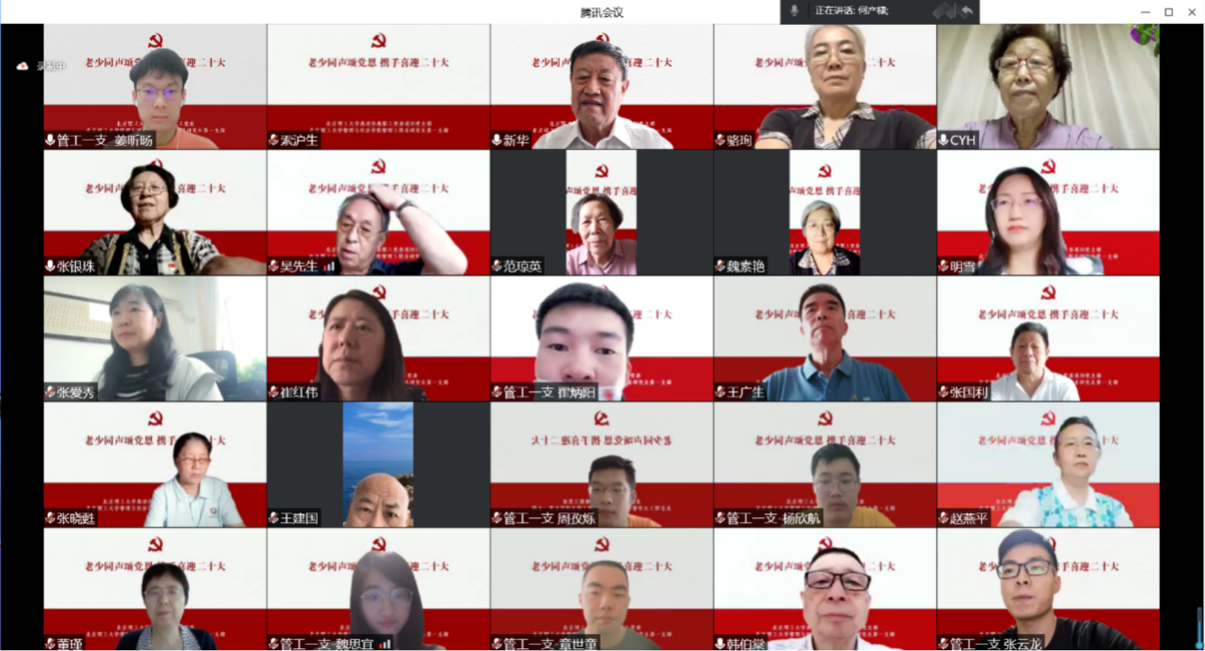 为庆祝中国共产党成立101周年,喜迎党的二十大胜利召开,深入学习领会习近平新时代中国特色社会主义思想,深入贯彻党的十九届六中全会精神,6月29日,管理与经济学院退休党支部和管工系研究生第一党支部通过线上视频会议的形式,开展了“老少同声颂党恩、携手喜迎二十大”之“庆七一、诗歌献党颂党恩”主题党日活动,离退休工作处处长宋希博,学校关工委秘书长、离退休教职工党委书记邹锐,管理与经济学院党委副书记、副院长彭明雪,老党员、青年学生党员等近60人参加活动。主题党日活动由学院退休党支部书记纪新华老师和研究生党支部书记姜昕旸老师共同主持。