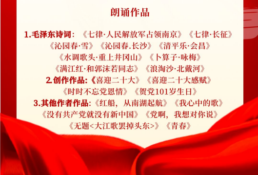 活动中,青老党员们用诗词朗诵的形式向中国共产党成立101周年献礼,迎接党的二十大的胜利召开。老党员与青年学生党员共朗诵了20多首主题诗词,其中包括《七律·长征》、《浪淘沙·北戴河》、《沁园春·雪》等经典诗词。老党员们还带来了独立创作的《喜迎二十大》、《喜迎20大感赋》、《时时不忘党恩情》、《喜迎二十大》、《贺党101岁生日》等诗词作品。声情并茂的朗诵,把大家带到了101年前的嘉兴红船,90多年前的橘子洲头,80多年前的长征路上,70多年前的雄师渡江。同时也把大家带到新中国建设以来,特别是改革开放以来的征程上。老少党员用朗诵中华传统诗词的形式表达了对中国共产党的赞美,对建党101周年的祝贺,对党的二十大的期盼。